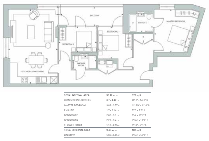 • Property Size: 970 SQFT