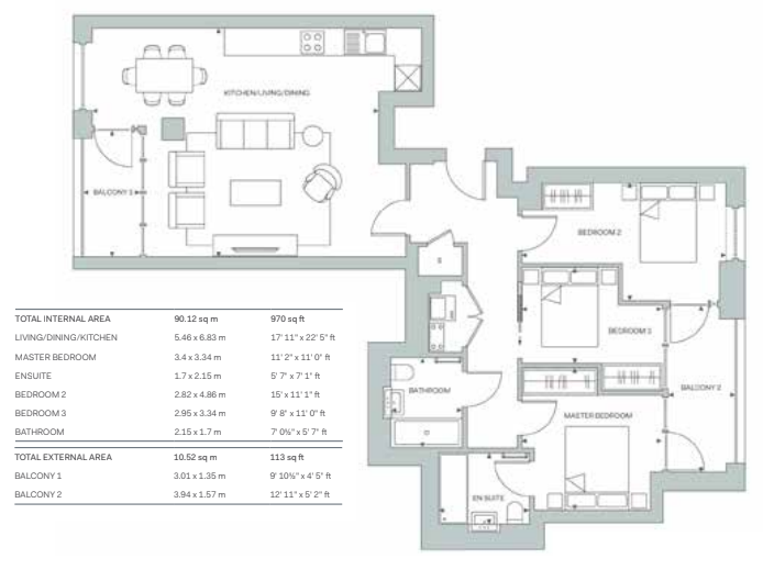 • Property Size: 970 SQFT