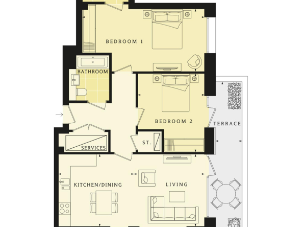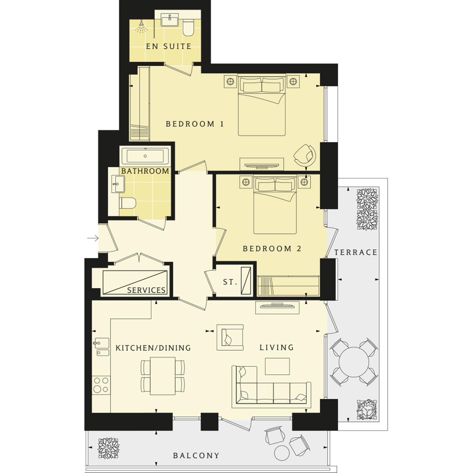 This elegant apartment on the ground floor features a south and west facing balcony and terrace, a dual aspect open plan kitchen/dining room and ample storage throughout. Both the bathroom and en suite come with Grohe brassware. Further benefits include underfloor heating and extract ventilation system. Totalling 855 sq ft/79.5 sq m. Parking included. Expected completion early summer 2018.