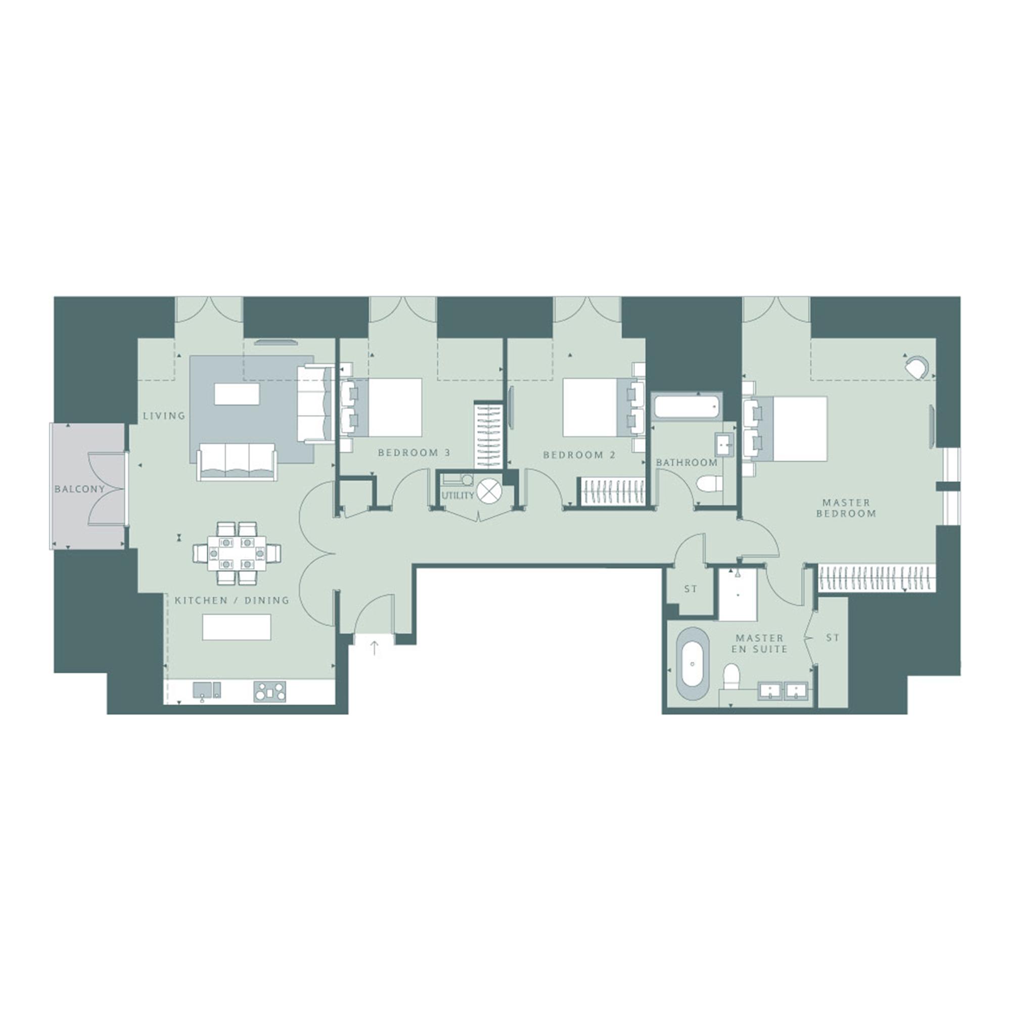 This impressive triple aspect penthouse features a spacious living area, and an open plan kitchen/dining room with direct access to the south-west facing balcony. The kitchen comes with Miele appliances and handleless furniture. The three bedrooms, one with a large en suite, offer bespoke fitted wardrobes. There is generous storage throughout. Totalling 1364 sq ft/126.8 sq m. Parking included.
